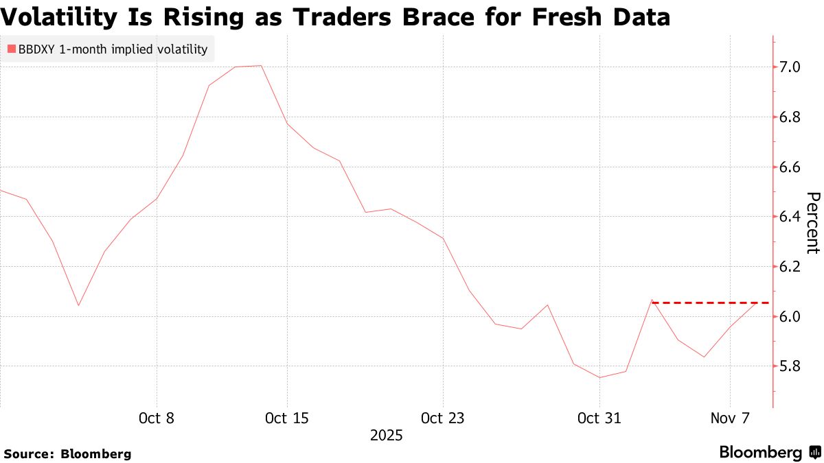 在美国联邦政府有望重新开门、即将发布包括非农报告在内的一系列数据前,交易员正加紧为美元波动性上升做准备,与美元现货指数挂钩的一个月期期权合约成本升至近一周以来的最高水平。