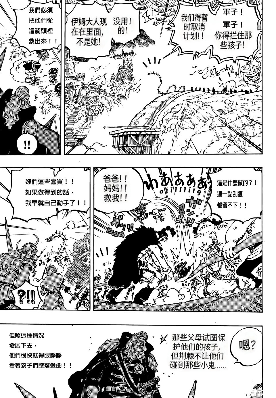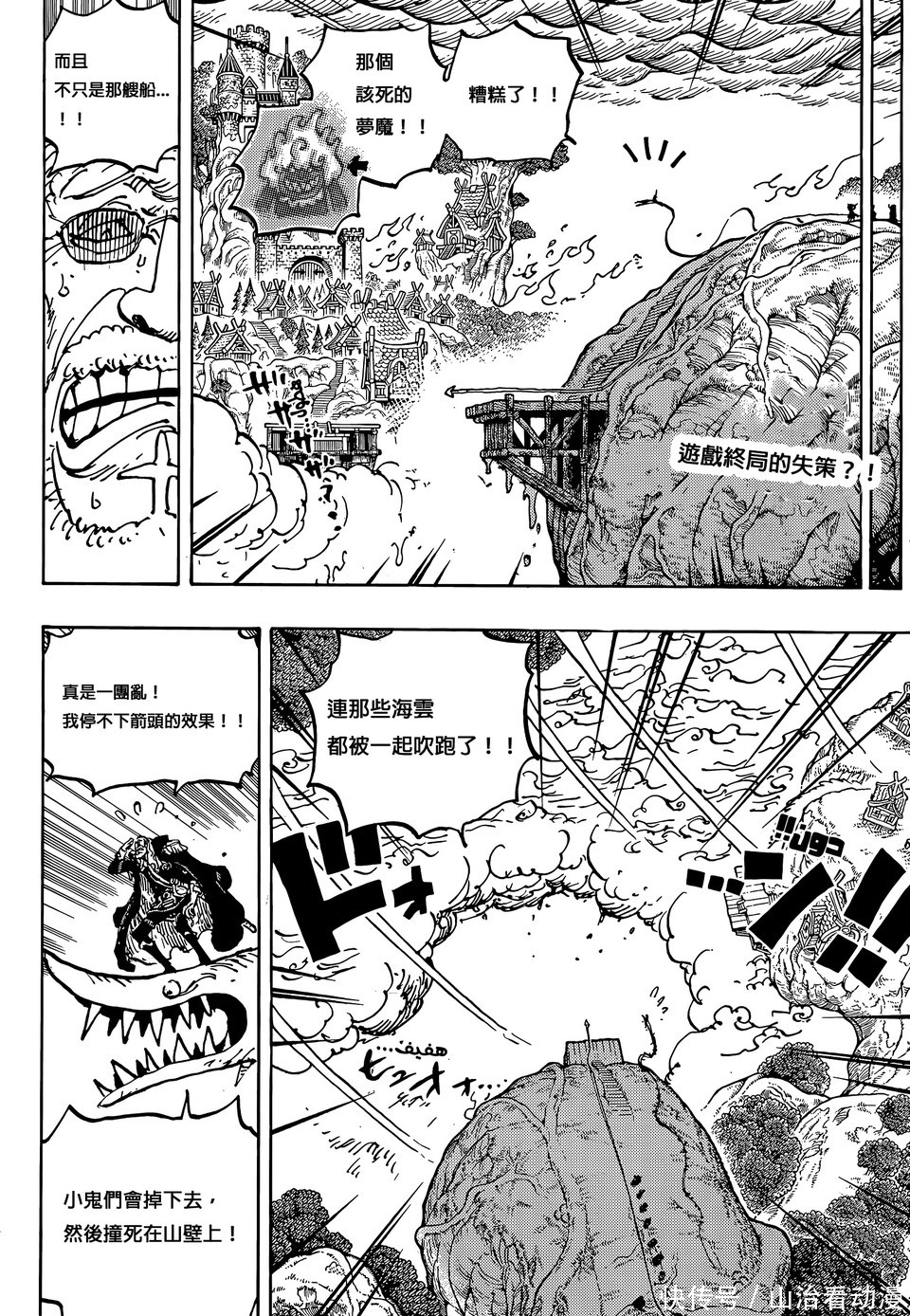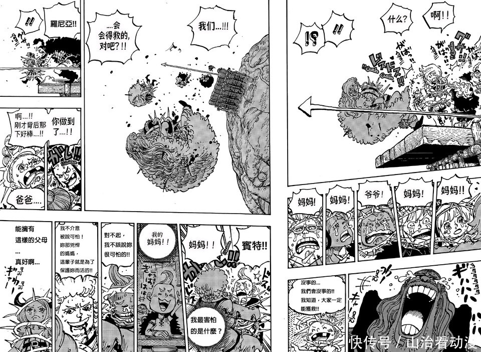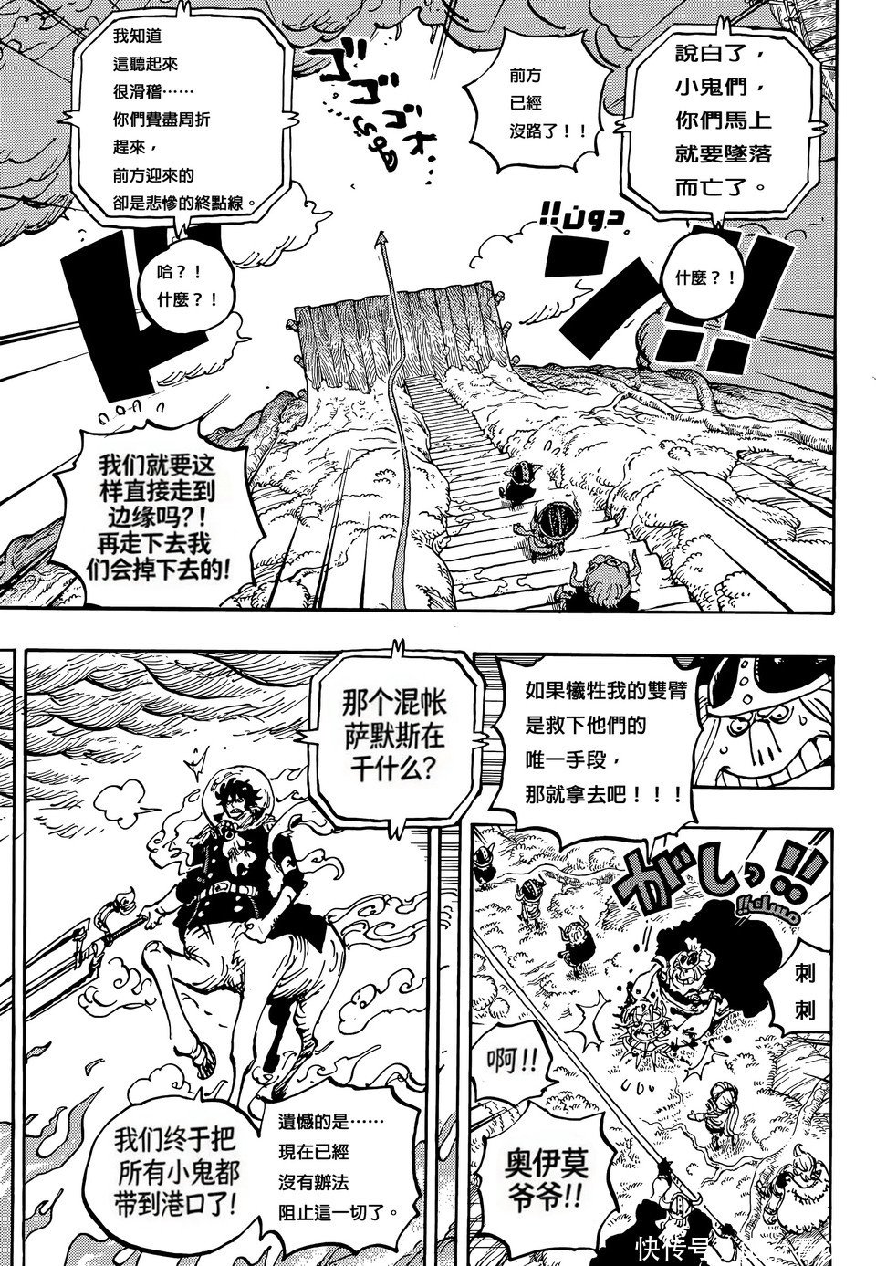海贼王漫画剧情中,巨人族大战越来越激烈了,神之骑士团已经入侵巨人族,他们绑架了巨人族的孩子,索玛兹圣带着孩子前往港口,他们打算用船只把孩子运送到圣地玛丽乔亚。不过出现了意外,船只被梦魇怪物摧毁,还出现了一个巨大的深坑,孩子有危险了。